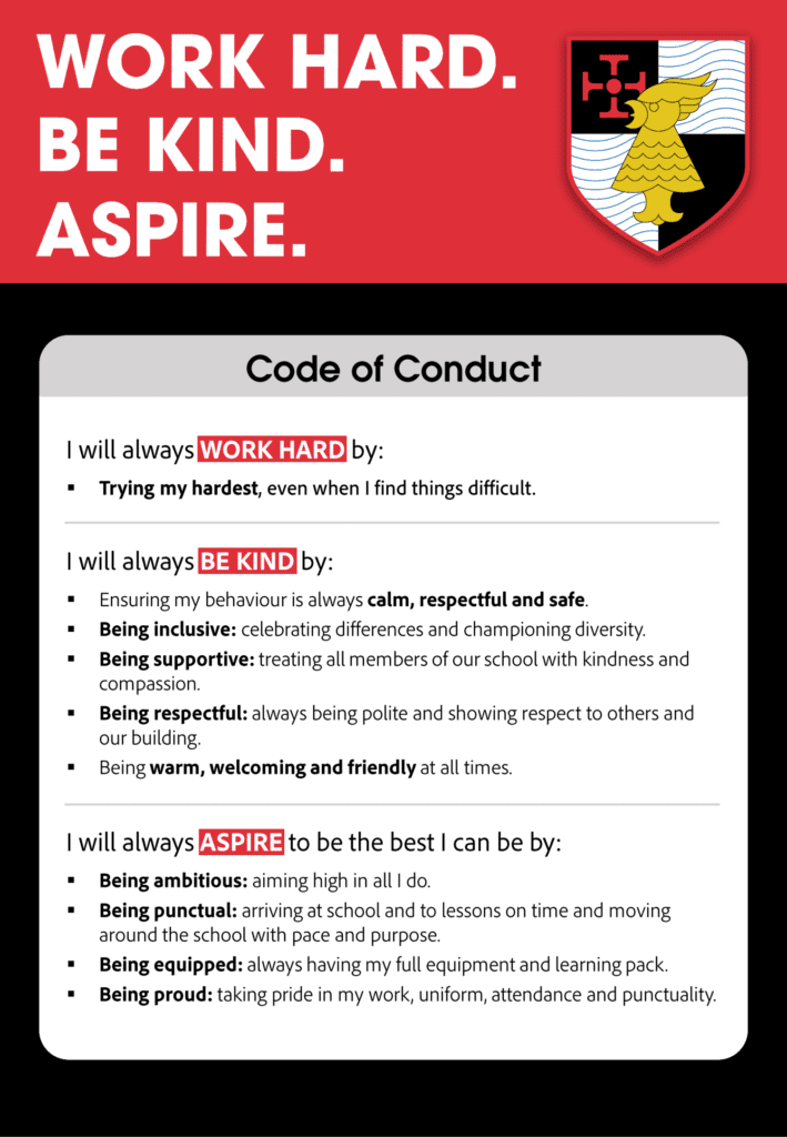 Our Code of Conduct sets out clearly what we expect from all members of our school community. To ensure that we have a harmonious environment for learning, where everyone can thrive, it is essential that the Code is followed at all times.